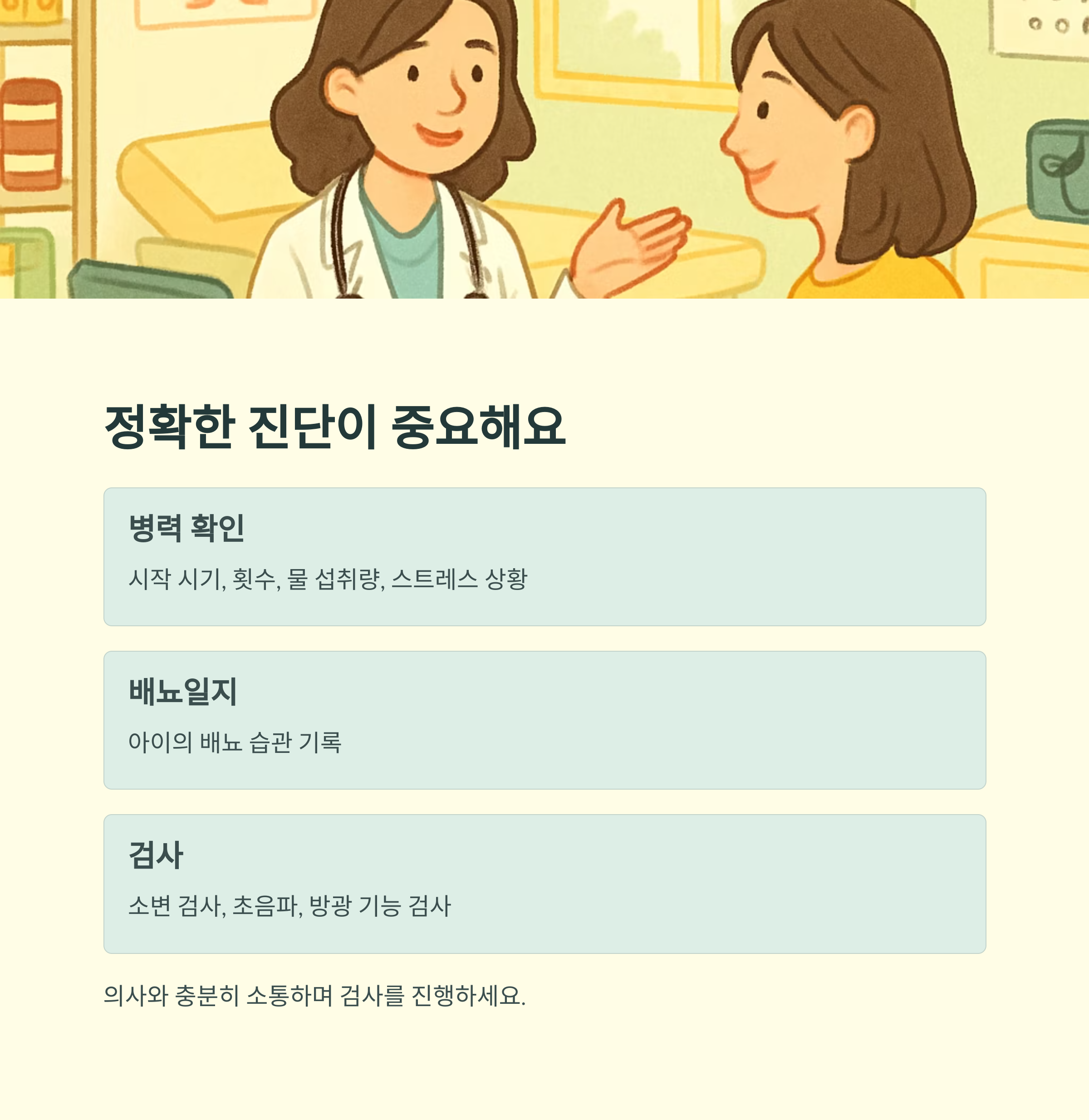 또, 아이의 배뇨 습관을 기록하는 배뇨일지를 작성하는 것도 도움이 될 수 있습니다. 소변 검사는 요로감염이나 당뇨병 같은 다른 질병 가능성을 확인하기 위한 필수적인 검사입니다. 필요에 따라서는 초음파 검사나 방광 기능 검사를 통해 방광의 크기와 기능을 더 자세히 확인할 수도 있어요.